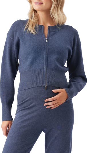 Introducing our soft and smooth Delta Zip Through Knit. It's our take on a bomber, only better. Featuring rib detailing on the collar, cuffs, and hem, this is the perfect outerwear piece to add to your maternity and nursing wardrobe. Complete with its functional double-ended front zipper allowing for multi-wear and easy breastfeeding access. Pair with the matching pant for a cool off duty look.