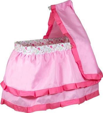 DELUXE CANOPY DOLL BED: PINK FLORAL - A bed to dream of! The Lissi Deluxe Canopy Doll Bed creates a cozy, enchanting sleep space that makes every doll or plush friend feel special. Designed with a charming pink floral pattern and tiered bed linens, this traditional canopy-style bed adds a touch of elegance and warmth to any playroom. Its soft pastel colors and delicate detailing inspire gentle, nurturing play while giving little ones the joy of caring for their favorite companions. Easy to assemble and beautifully crafted, it provides a realistic touch that enhances imaginative storytelling and role-play. Equipped with smooth swivel wheels, the bed can be easily moved around—perfect for bedtime routines, make-believe games, or playtime adventures. The sturdy design ensures long-lasting fun and stability, while the classic canopy feature makes every bedtime feel magical. Perfect for dolls up to 18 inches, this deluxe bed encourages empathy, emotional expression, and creativity as children explore caring and affection through play. Recommended for ages 3 and up.