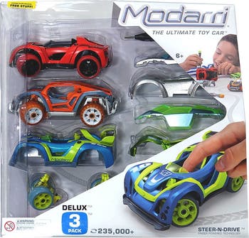 MODARRI: DELUXE CAR 3 PK - S1 STREET, T1 TRACK, X1 DIRT - The Mix-and-Match Modarri Building System allows you to design your own custom super car. Includes interchangeable parts that allow for endless car designs! It's fun and easy to build your car by stacking the pieces and then tightening a few built-in-screws! Cars have amazing driving mechanism with real steering and suspension - just put your finger in the driver's seat and GO! IT'S EASY AS 1, 2, 3! 1. DESIGN: Modarri's Mix-and-Match Building System allows you to design your own custom car. 11 interchangeable parts per car allows for BILLIONS of car designs! 2. BUILD: Super Quick Build Times! Modarri cars are built in less than a minute! Easily build your car by stacking the pieces and then tightening a few built-in-screws with the included hex screwdriver. 3. DRIVE: Modarri cars amazing driving mechanics! Put your finger in the driver's seat and just point where you want to go! The power of your custom supercar is at your fingertips!