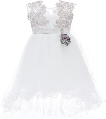 The Demi Glitter Dress is an enchanting piece designed to capture hearts. Its bodice features shimmering silver floral lace, complementing a belt of delicate gemstones. A fabric rose with beaded accents and tulle cascades from the waist, enhancing the dress's whimsical charm. Perfect for weddings, birthdays, or any celebration where sparkle meets sophistication.
