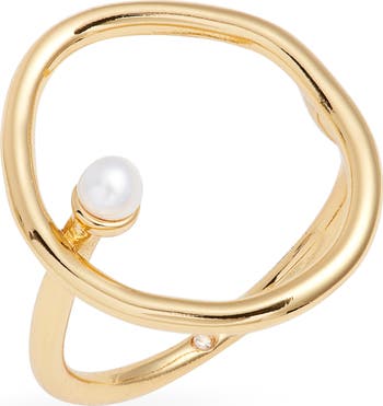 Playful, sculptural and contemporary, this ring features an open circle paired with a floating freshwater pearl and finished with 14-karat-gold plating.