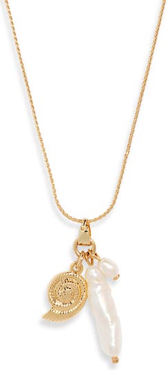 A shell coin is perfectly paired with freshwater pearls in this beach-minded pendant necklace plated in 14-karat-gold.