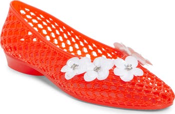 Your favorite '90s-nostalgia footwear is back—and more comfortable than ever—in this jelly ballet flat made using the South Korean label's signature square-perforation weave in flexible PVC. Wonderfully weird and certainly playful in its aesthetic, the topline is embellished with crystal-centered flowers for a playful mix of polish and whimsy.