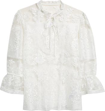 Your romantic side is evident in an airy lace top tied at the neck with two sweet bows and finished with the flared cuffs of a poet.