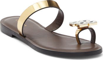 Sparkling crystals highlight the dainty toe loop of this minimalist sandal that exemplifies modern sophistication.