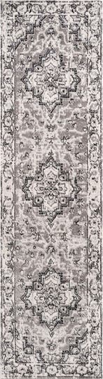 This ornate medallion rug has a geometric pattern that adds modern Bohemian style to a living room, bedroom, entry or kitchen. Varied tones of gray mingled with an ivory background give this rug a hand-woven, vintage vibe. The busy allover pattern is pet-friendly and great for kids too.