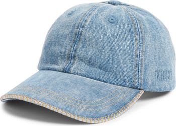 Contrast blanket stitching frames the curved brim of this medium-wash denim cap cut from cotton canvas with embroidered eyelets and a signature side logo. Six-panel construction and an adjustable back strap provide a customizable fit.