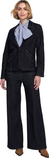 Tailored denim blazer with clean lines and a softly structured silhouette. Single-button front closure adds polish without sacrificing ease. Notched lapel elevates the look with a refined, timeless detail. Functional flap pockets offer utility while maintaining a sleek design. Mid-weight cotton blend with stretch for comfort and shape retention. Easy-care construction—machine washable and designed to wear well over time.