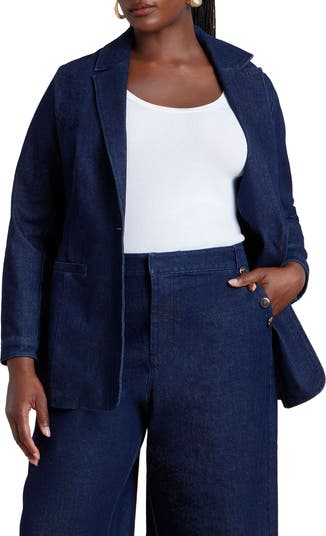 A tailored stretch-denim blazer with a notch lapel, single-button closure, and flap pockets for polished ease.