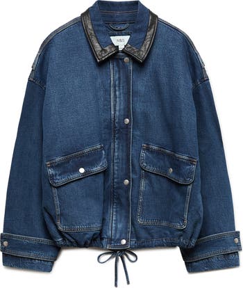 Faux-leather trim provides a distinguished finishing touch for a utilitarian denim bomber jacket in a relaxed fit.