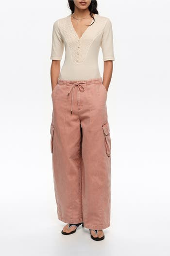 Ankle-length barrel cut pants in 100% washed cotton with concealed zip, button, adjustable waistband, and flap pockets.