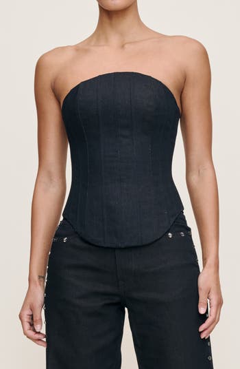 Keep your off-duty look on point with this corset-inspired top fashioned from nonstretch denim.