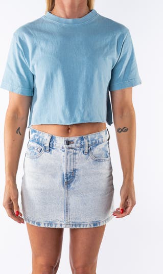 The definitive denim mini skirt. Hits mid thigh. Slightly distressed and in our signature bleached indigo color for a beachy, surfy vibe. Fits slightly small for women.