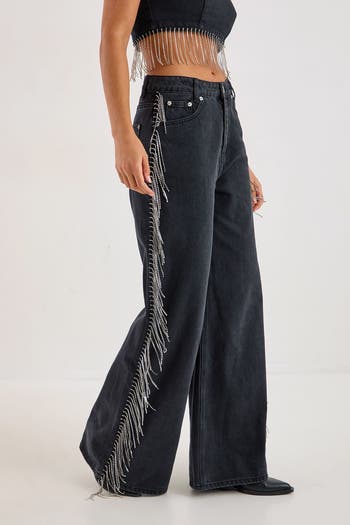 Make a statement on your next night out with these eye-catching Diamanté Tassel Straight Leg Jeans from NastyGal. The dramatic metallic chain tassels cascade down the outer leg, creating movement and catching the light with every step.