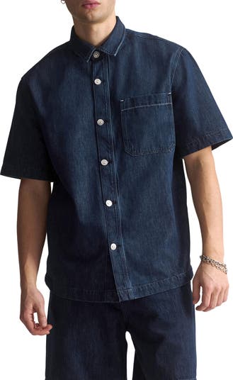 Industrial graphics further the workwear influence of this short-sleeve shirt cut from cotton denim in a fit built to get things done or to kick back and do nothing at all.