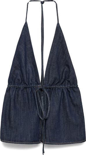 A dainty bow tethers the open front of this plunge-neck halter top made from dark-wash denim.