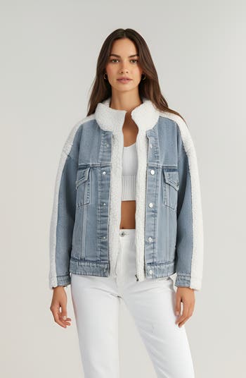 A fresh take on the classic jean jacket, this piece features soft faux shearling trim along the collar, sleeves, and seams for a cozy, textured look. The relaxed, slightly cropped fit pairs perfectly with everything from jeans to skirts, while the button-front closure and chest pockets add authentic denim details. Lined with plush faux shearling, it's designed to keep you warm and stylish as temperatures drop. Throw it over your favourite basics for a modern twist on casual outerwear.