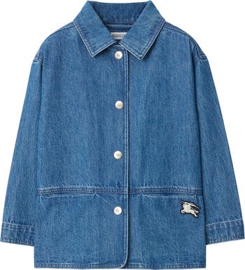 A point-collar jacket in denim, washed for a softer feel. The style is finished with logo-embossed press studs and an embroidered Equestrian Knight Design badge.||Press-stud closure|Point collar|Front slip pockets|Appliquéd Equestrian Knight Design at pocket