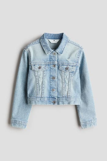 Jacket in stretch cotton denim with a collar and metal buttons down the front. Fake chest pockets with a flap and button.
