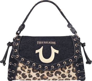 Take a walk on the wild side with this denim and leopard flap bag from True Religion. Featuring lace-up eyelet trim and a bold horseshoe logo on the flap, this bag combines contrast textures and edgy details for a standout statement piece.
