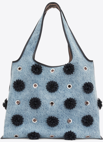 Denim Market Tote with Leather Flowers