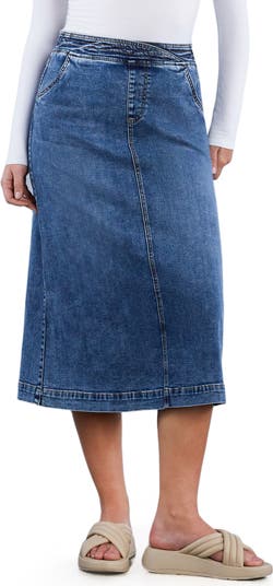 A crossed over detail welcome tucked-in styles on this midi skirt crafted from low-stretch denim in the perfect indigo wash.