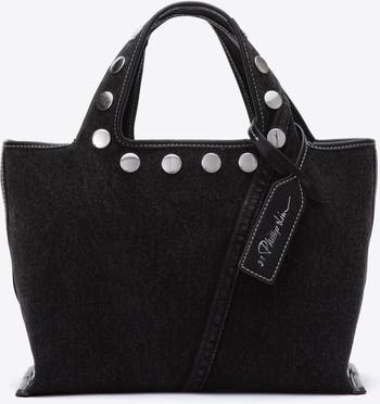 Mini market tote is a playful take on a lunch bag realized in washed black denim with stud accents. Logo bag charm with a silver-tone metal logo plaque is a cheeky homage to our home city.