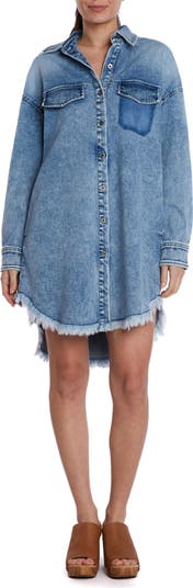A high-low fringy raw hem adds kicky fun to a mini denim shirtdress fashioned with roll-tab sleeves.