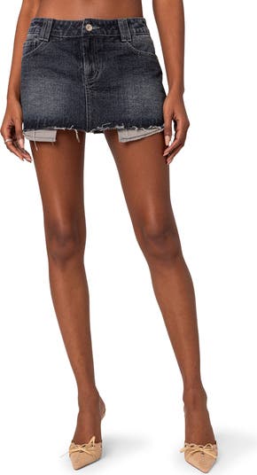 Perfect your casual-cool game in this stem-showing nonstretch denim skirt punctuated with a frayed hem and peekaboo pocket linings.