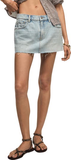 Built-in shorts mean added coverage in this raw-hem miniskirt made from nonstretch light-wash denim featuring cool distressed details.