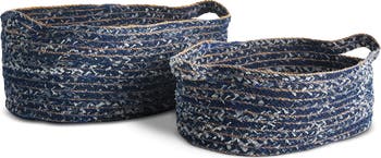- Made from recycled denim in the deepest of blue hues, this set of oval baskets don't just add storage, they also add a pop of color and rich texture to any space. Soft to the touch, they are great for towels, toys or anything needing to be tucked away. Interior use. Dust with soft cloth. Do not clean with harsh chemicals. 22 x 12 x 7.5;24 x 13 x 9.5 22 x 12 x 7.5;24 x 13 x 9.5