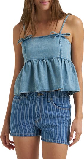 Pert bows sweeten the style story of this peplum-flounced denim camisole with a smocked-elastic back that stretches to ensure a perfect fit.