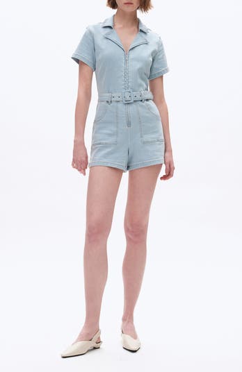 A slender belt defines the waist of this light-wash denim romper framed by abbreviated sleeves.