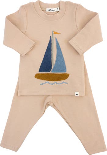 Snuggly soft cotton top and matching pants. Featuring a sailboat applique on the tee. Designed in Minnesota. Available in infant sizes.