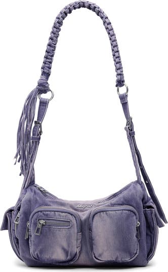 A faded denim exterior and brushed hardware define a '90s-inspired shoulder bag fitted with multiple pockets and an adjustable strap for on-the-go convenience.