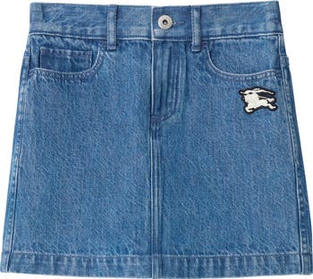 A skirt in denim, washed for a soft finish. The five-pocket style features an embroidered Equestrian Knight Design badge and is elasticated at the back for a more comfortable fit.||Button and zip closure|Appliquéd Equestrian Knight Design at front