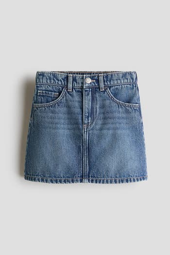 5-pocket skirt in washed cotton denim. Covered elastication at the back of the waist and concealed, adjustable elastication at the front for a perfect fit. Zip fly and a button.