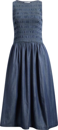 Denim Smocked Boat Neck Maxi Dress