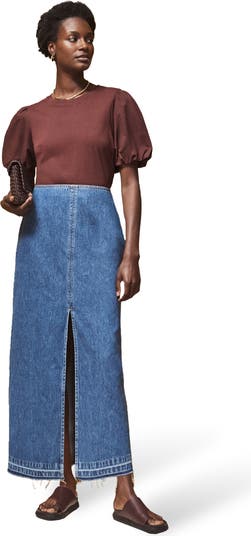 Elevate your wardrobe with this sleek maxi skirt, featuring a clean silhouette and front split for ease of movement. Finished with raw-edge hems for a modern touch, it's a versatile piece that works effortlessly from day to night.