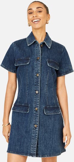 This dress is a short-sleeve, button-front denim shirtdress crafted from cotton with added stretch for comfort and ease of movement. It features a structured collar, two flap pockets on the chest, and two roomy front patch pockets at the hip. The dark wash and topstitch detailing give it a classic, timeless denim look, while the above-the-knee length offers a modern, flattering silhouette perfect for casual outings or relaxed weekends.