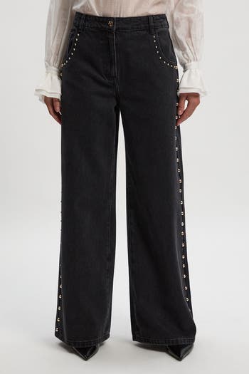 These Karen Millen Denim Studded Wide Leg Trousers combine timeless denim craftsmanship with modern detailing for the discerning woman. The statement studding along the outer seam transforms these trousers from everyday staple to conversation piece.