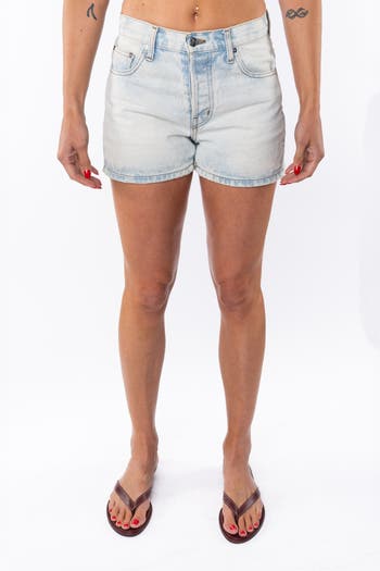 The essential everyday denim short. Made in bleached indigo. Hits mid waist and ridged fit for structure. 5 pockets style. Made in LA. 100% cotton 13 oz. bull denim. 3 1/4" inseam.