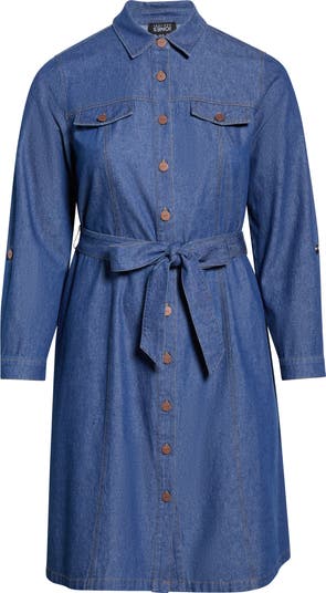 A removable tie belt defines the waist of this button-front shirtdress cut from nonstretch cotton denim in a midi-length silhouette. Roll-tab cuffs enhance versatility