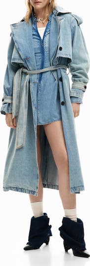 A classic trench coat gets a casual makeover thanks to nonstretch denim construction and distinctive belted cuffs.