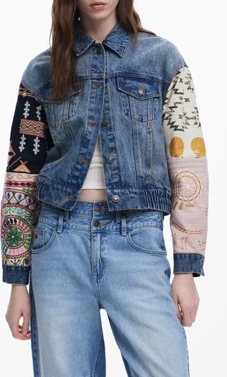Embroidered contrast sleeves add an extra dose of vintage-chic style to this nonstretch-denim trucker jacket.