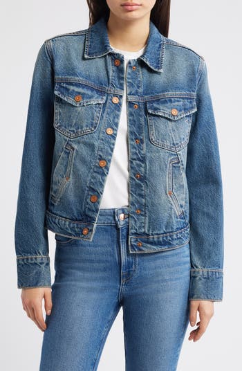 Complete your casual looks with this fitted trucker jacket made from vintage-vibe nonstretch denim and refreshed with offbeat front pockets.