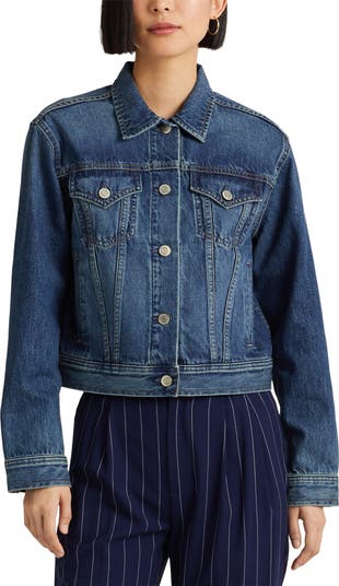 Layer up your look with this tried-and-true denim jacket fashioned with classic trucker styling and a contemporary short length.