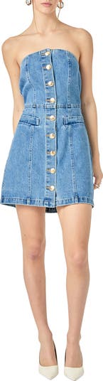 Golden buttons march down the front of this strapless denim mini designed with an elastic back and a light-blue wash.
