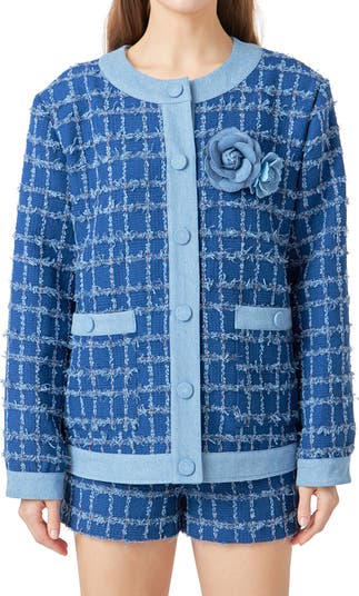 Fabric rosettes blossom on the chest of this posh denim tweed jacket elevated by contrast trim and streamlined pockets.