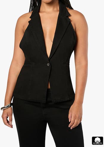 - This denim vest features a low-cut V-neck with a single-button closure, notched lapels, front welt pockets, and an open back. Open back Low V neckline Notch collar One button at center front Two welt pockets Princess seams 100% Cotton Machine wash with like colors. Do not bleach. Tumble dry low. Iron cool. Do not dry clean.